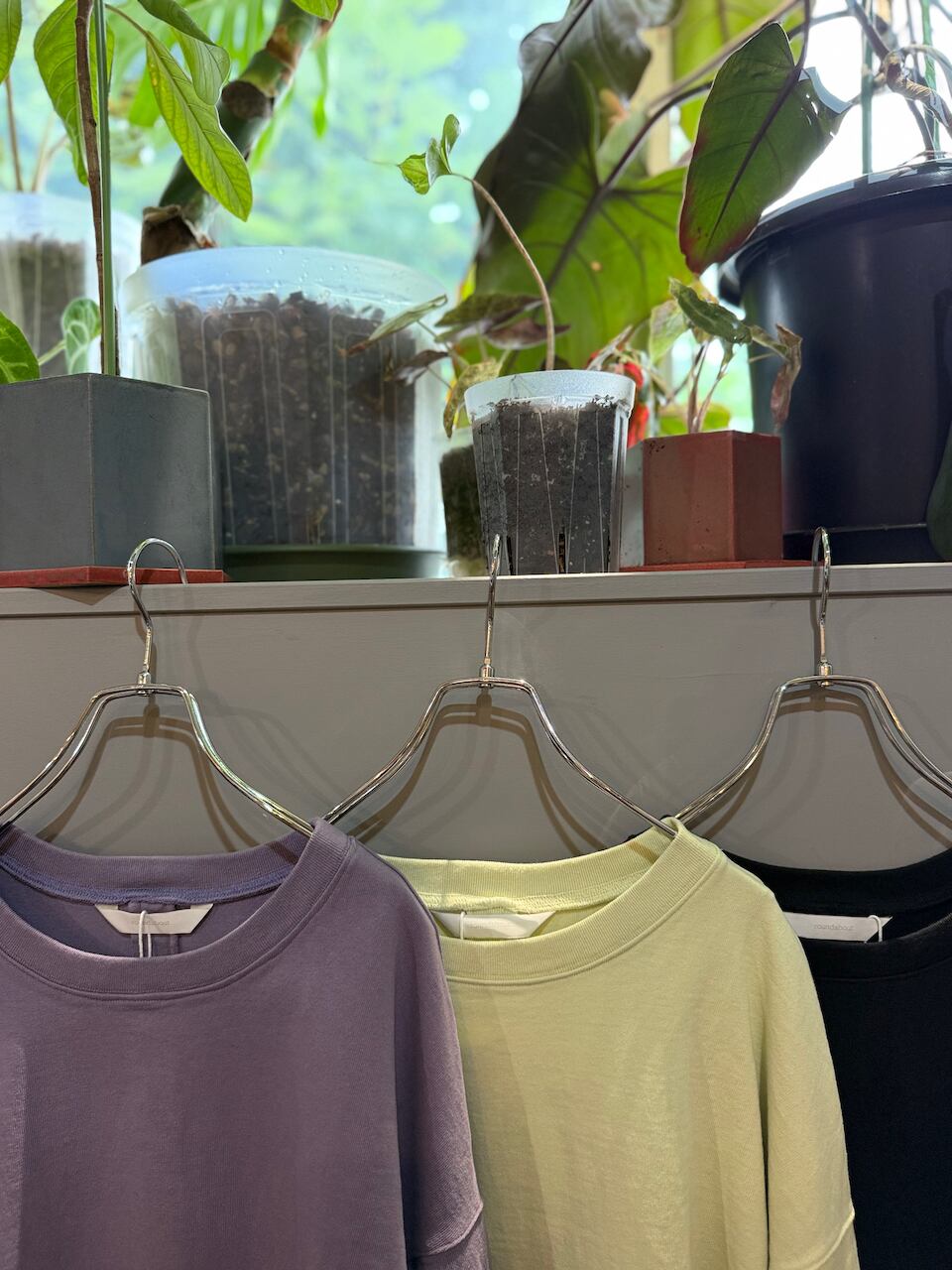 生地は空気の力で糸を撚り合わせる特殊な方法で紡がれた糸を、引き揃えて度詰めで編み立てた天竺。