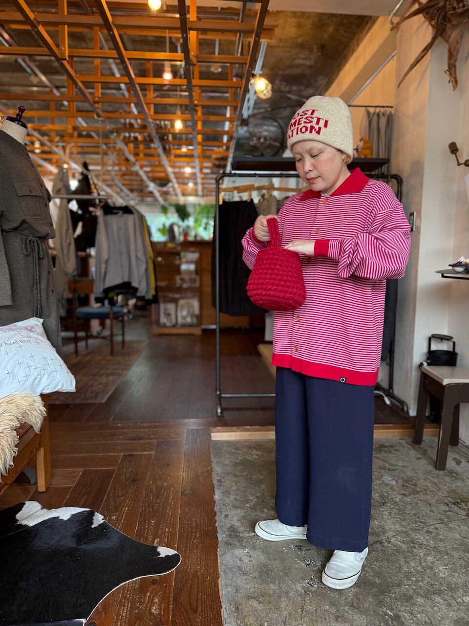 オーバーサイズのニットワッチを被ったような、ニットバケットのような独特なシルエットのニット帽。