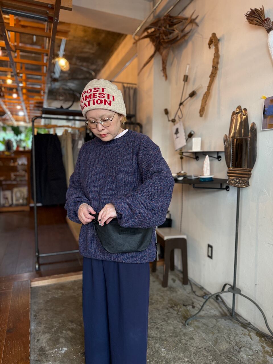 顔が埋まるようなフォルムが特徴で、ジャガード編みで"POST DOMESTICATION"とシーズンテーマを。
