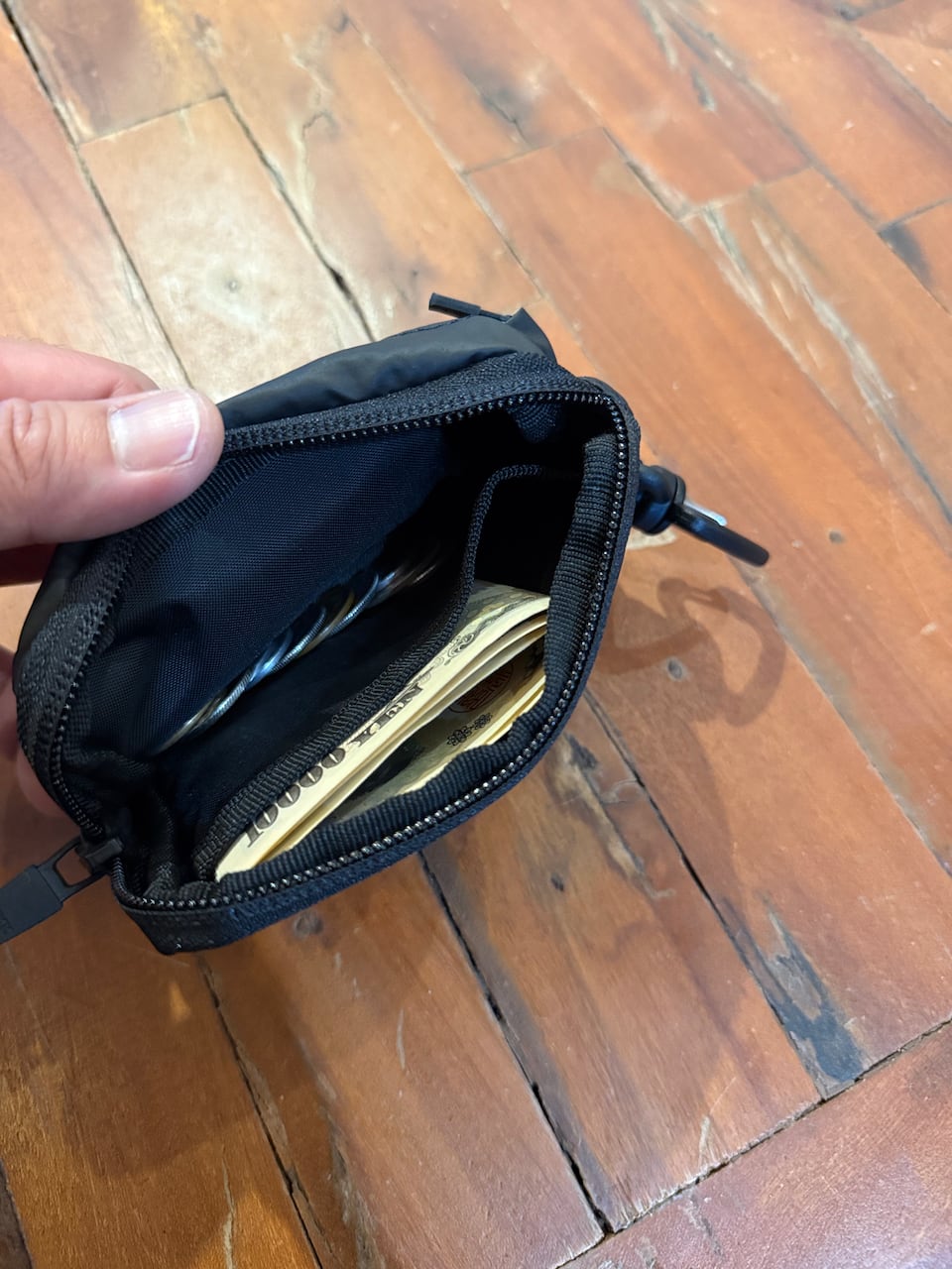 ポケットが 2 箇所にあり、カード・お札・小銭などを小分けにすることができます。
