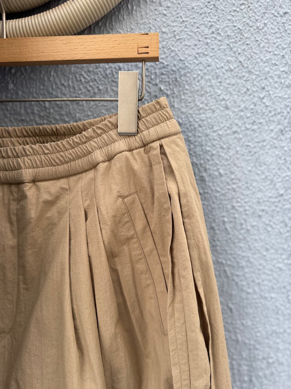 3タックとったウエストから広がって膝下から一気にテーパードするバルーンシルエットのボトムス。