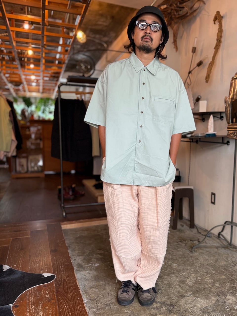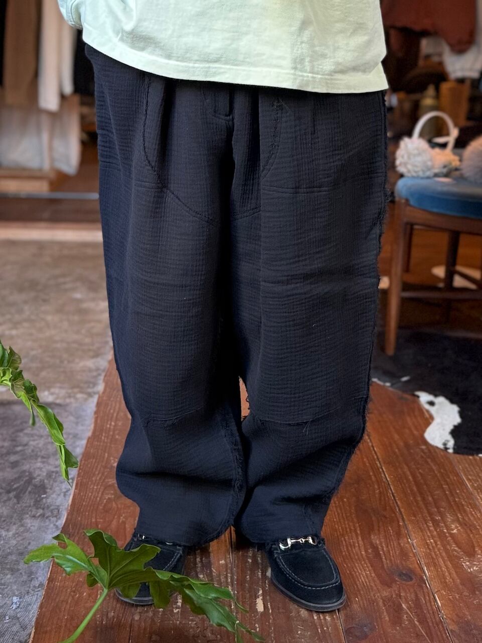 ダブルニーのワークパンツを柔らかな生地で作ることでいい違和感のある仕上がりです。