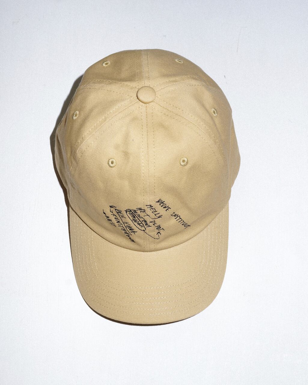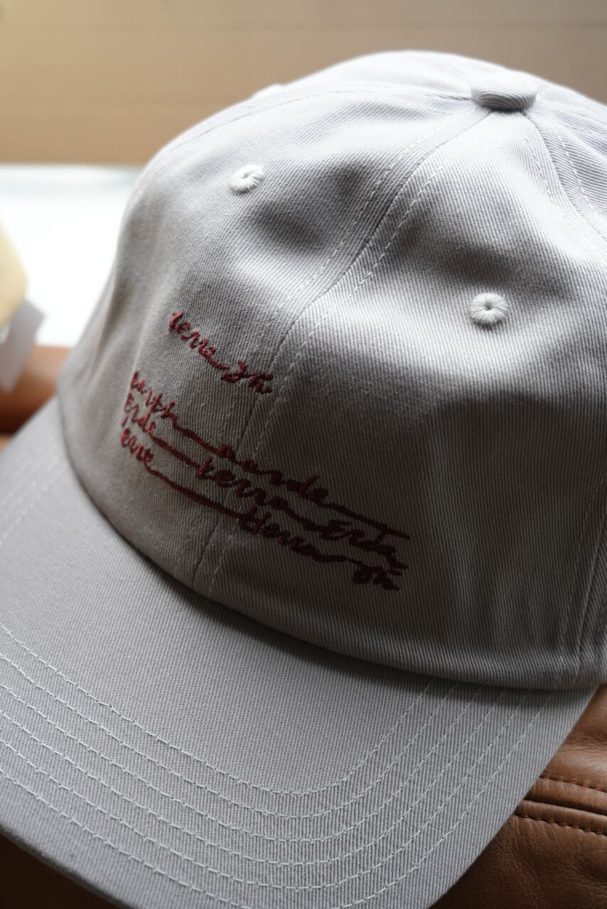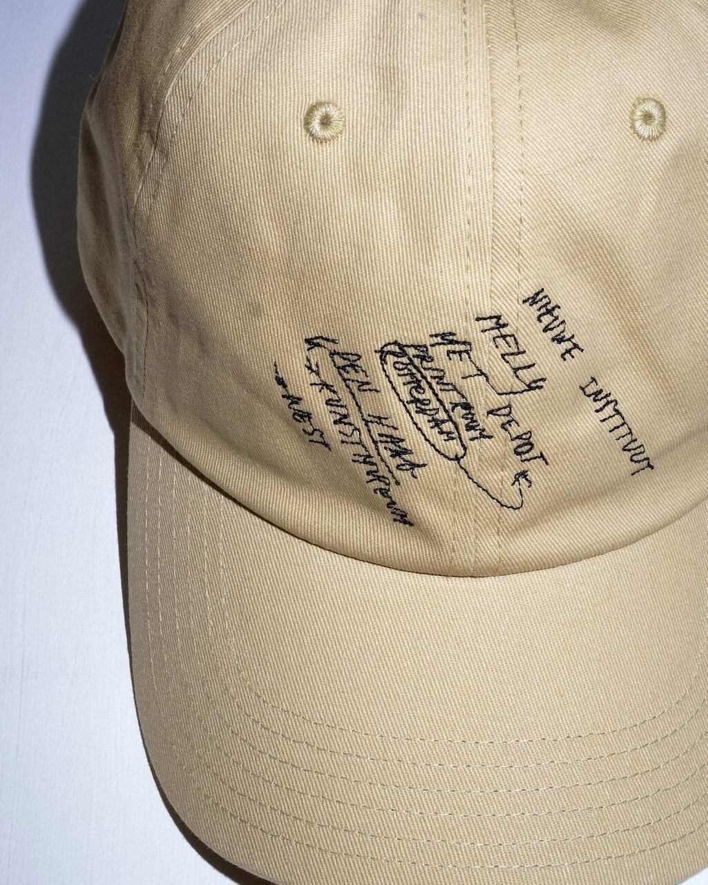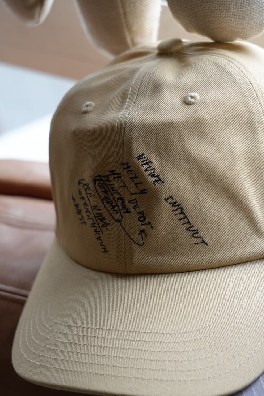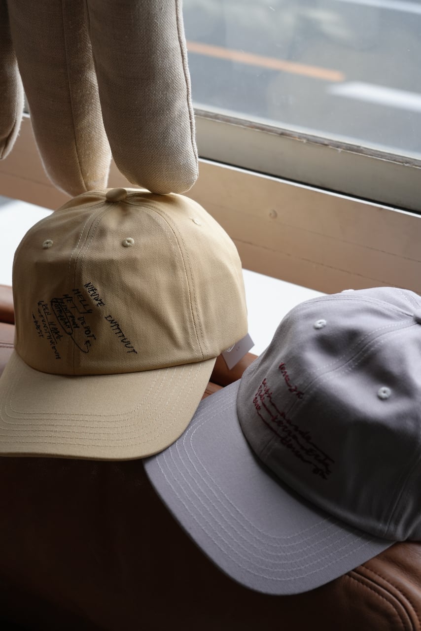 手書きで書かれた本のメモ、道端のタイル、付箋のメモ書きなどからトレースし、ロゴに仕上げて刺しゅうした落書きシリーズのCAP。