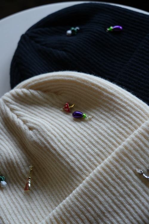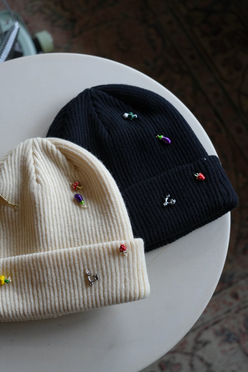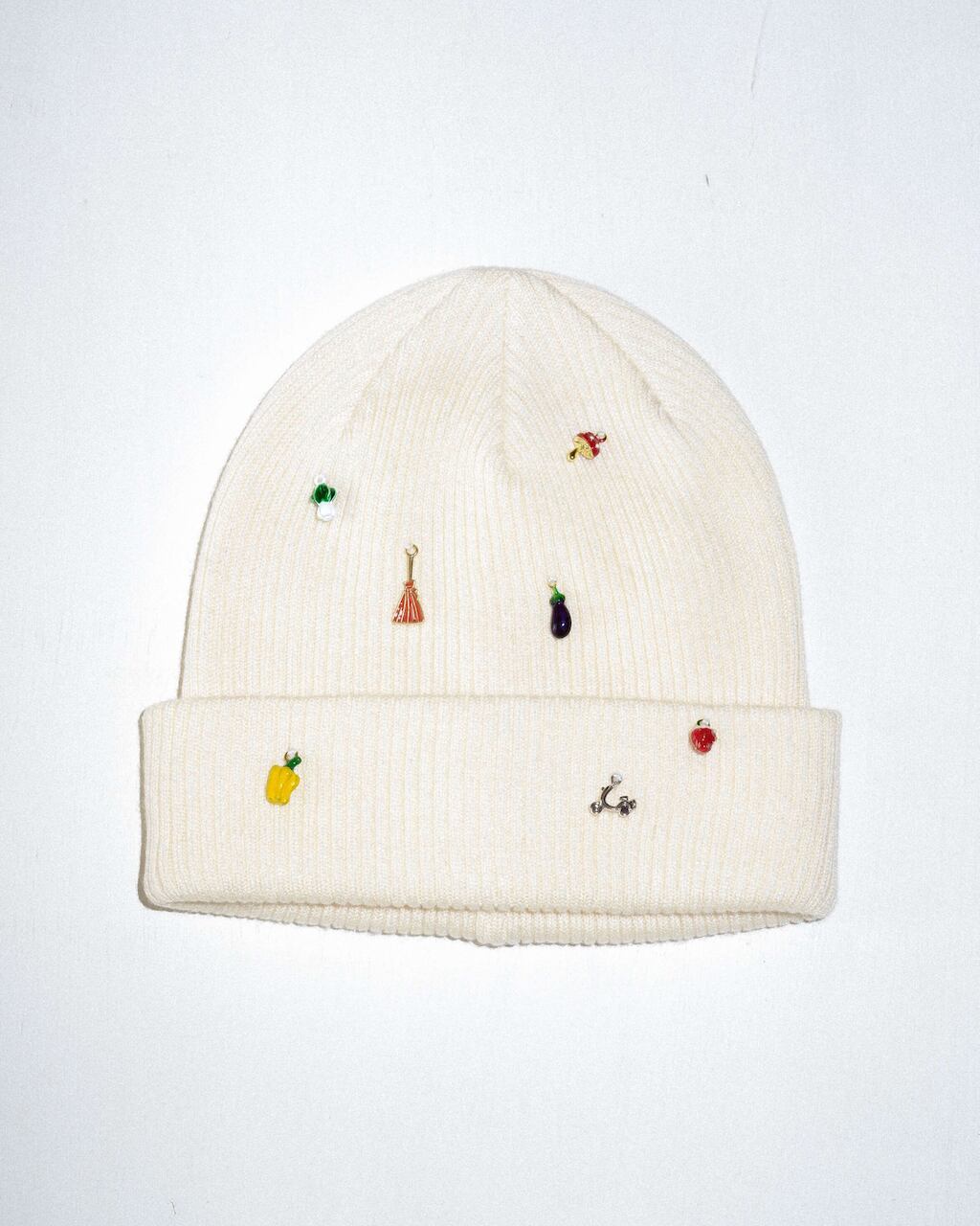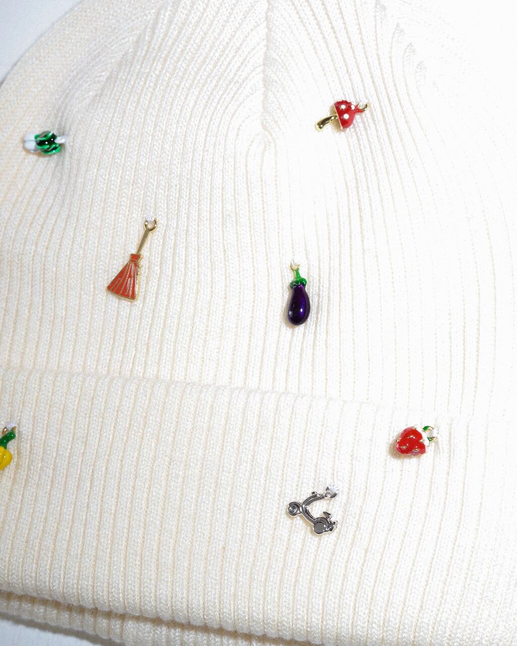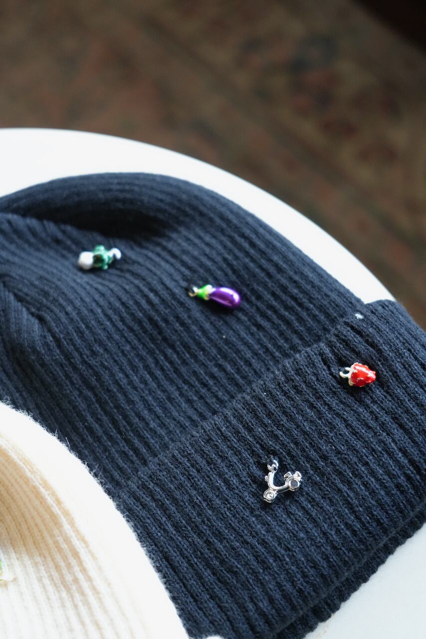 リブ編みのシンプルなニットワッチにはおもちゃのような小さなチャームをたくさん縫い付け、目を惹く遊び心あるデザインに。
