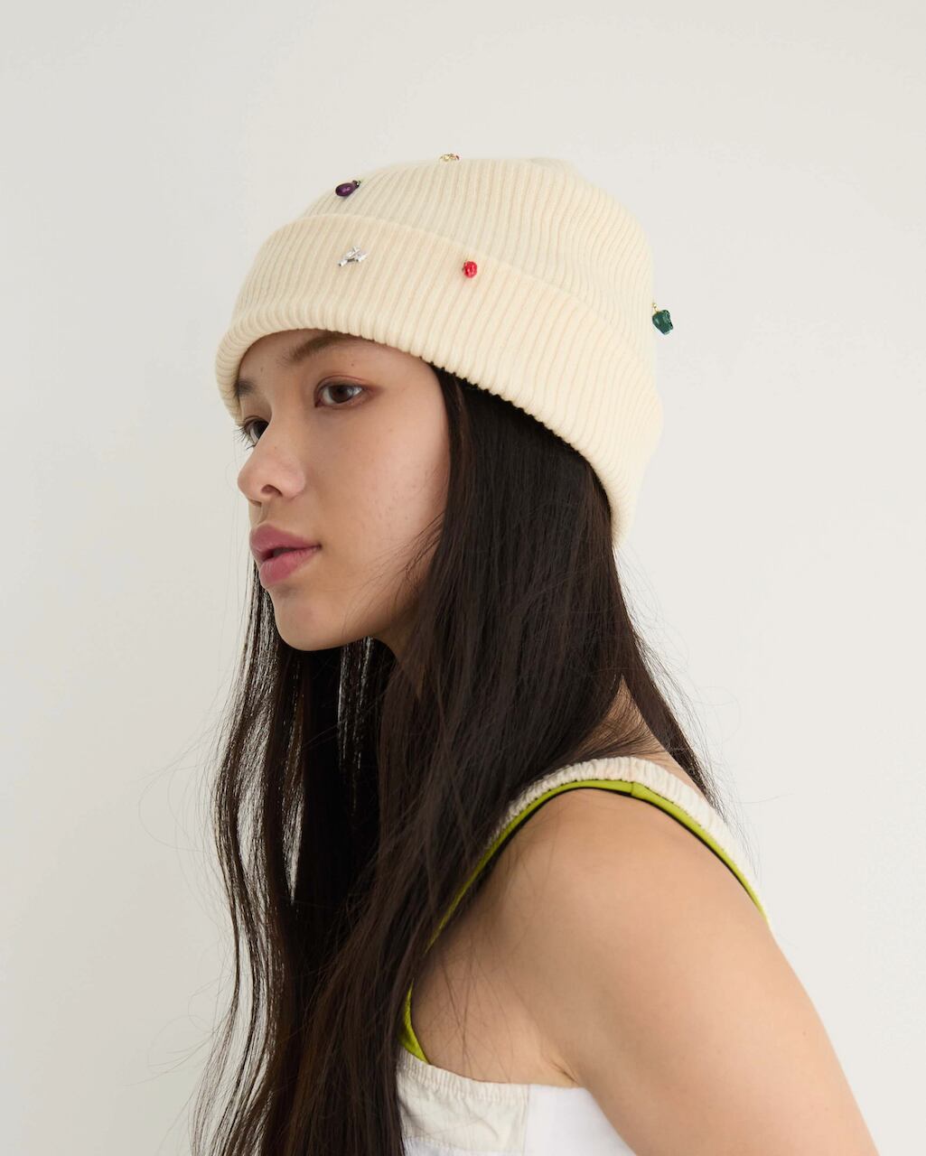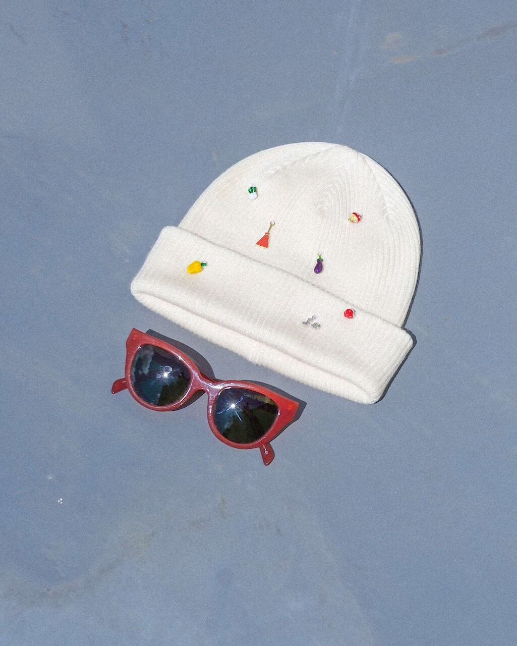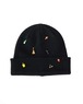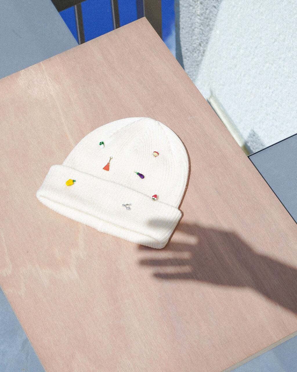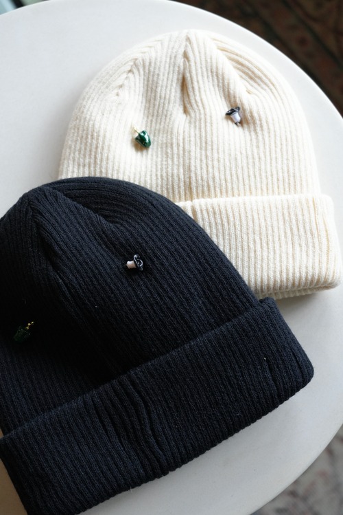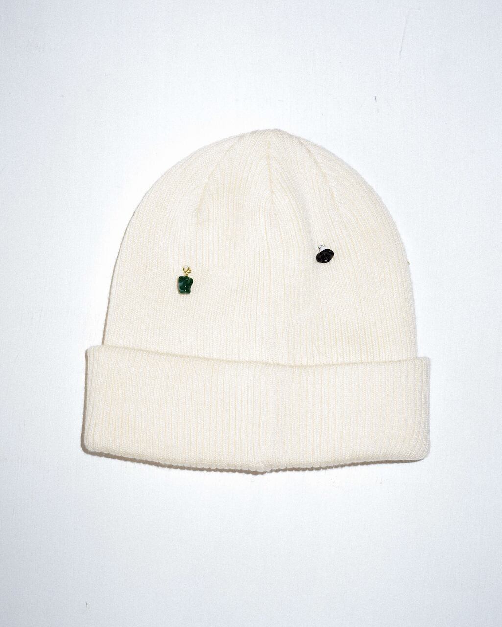 リブ編みのシンプルなニットワッチにはおもちゃのような小さなチャームをたくさん縫い付け、目を惹く遊び心あるデザインに。