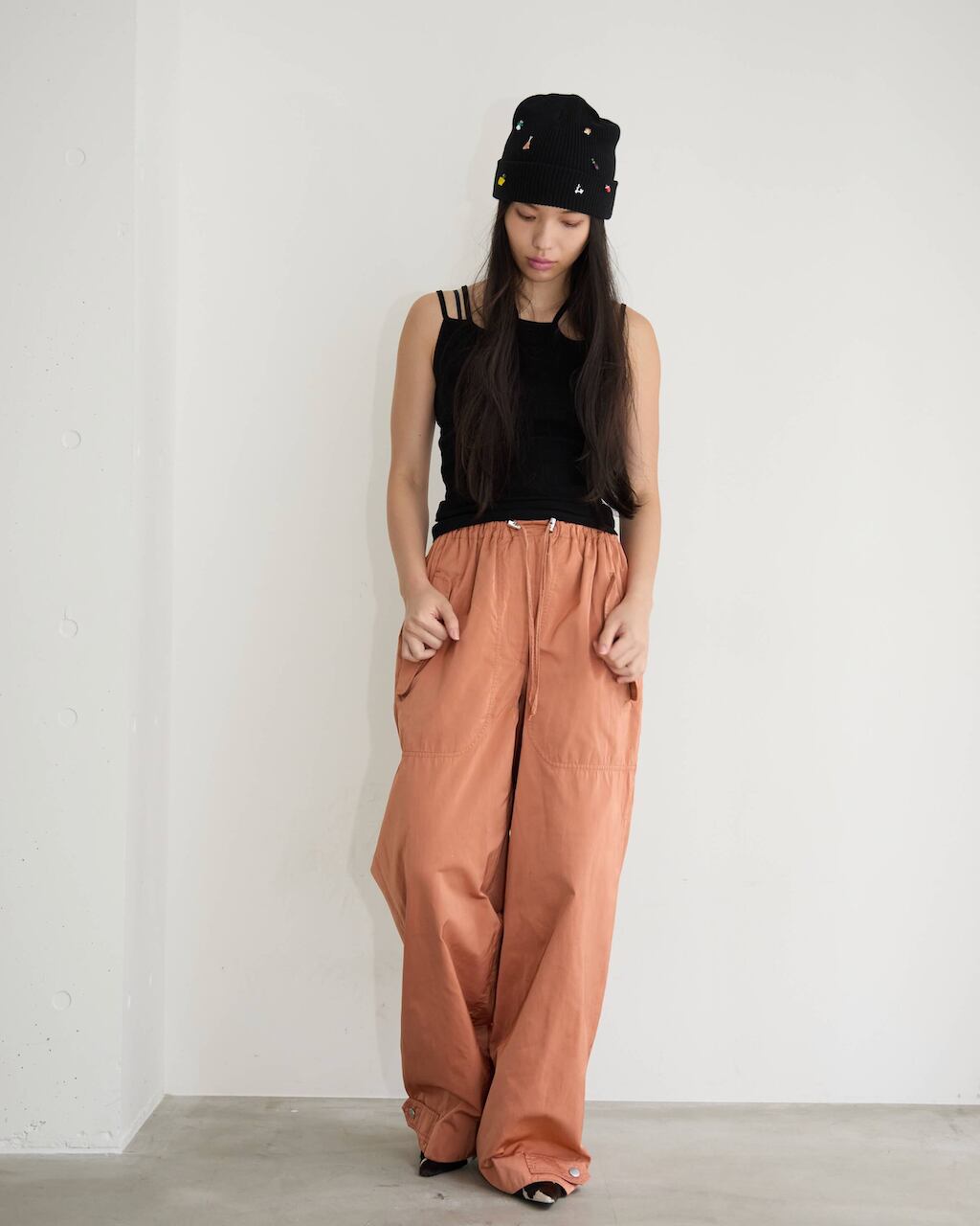 ゴムの入ったウエスト、タックやプリーツなどは伸ばさず計測しております。