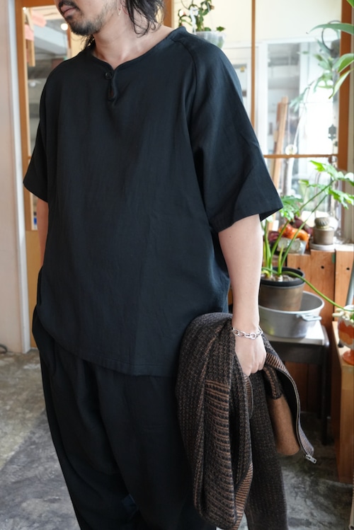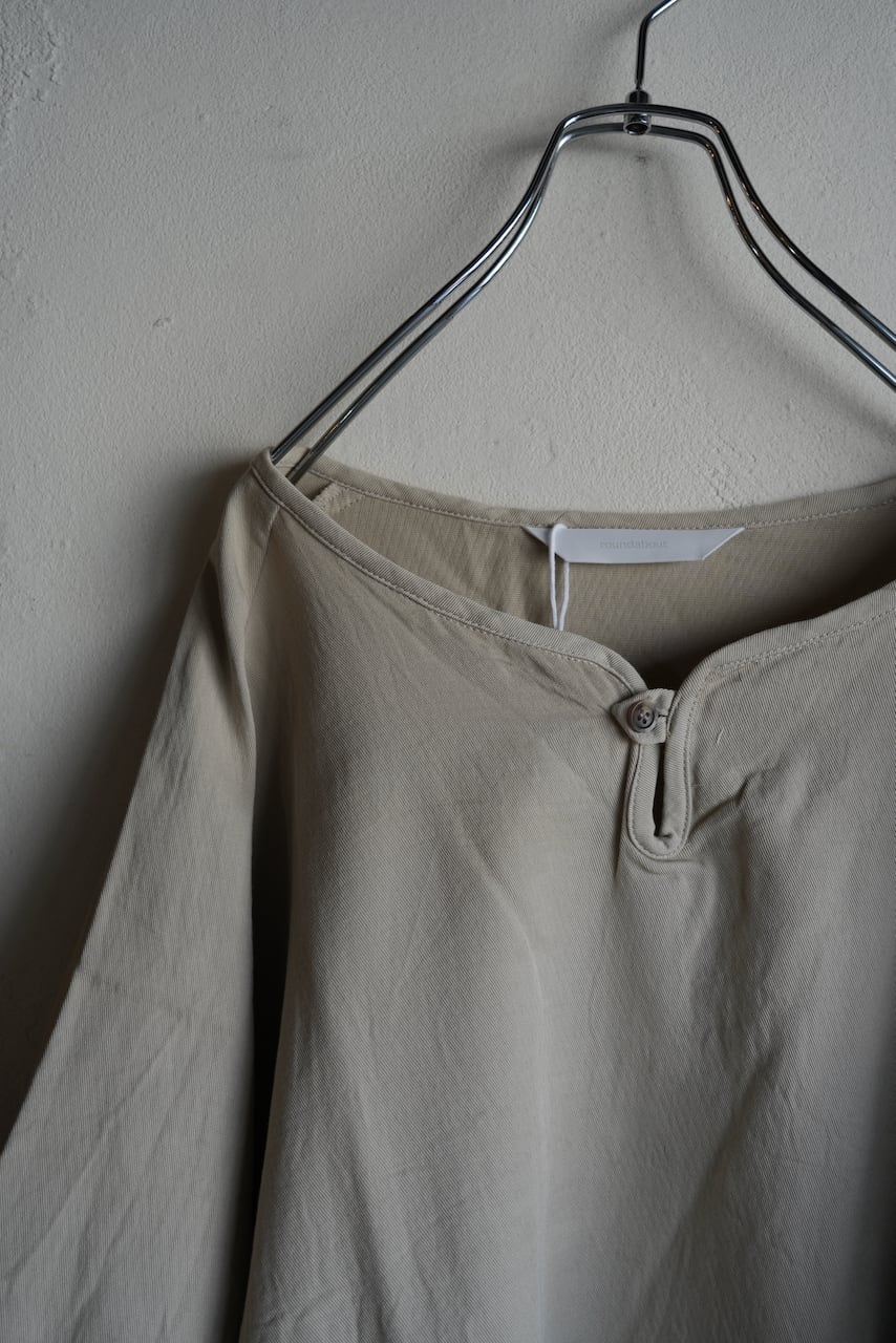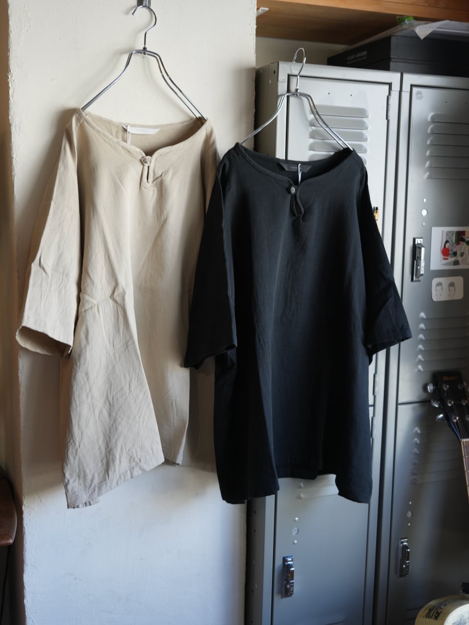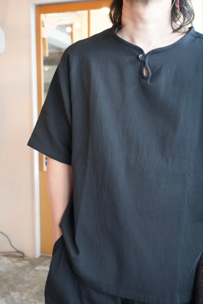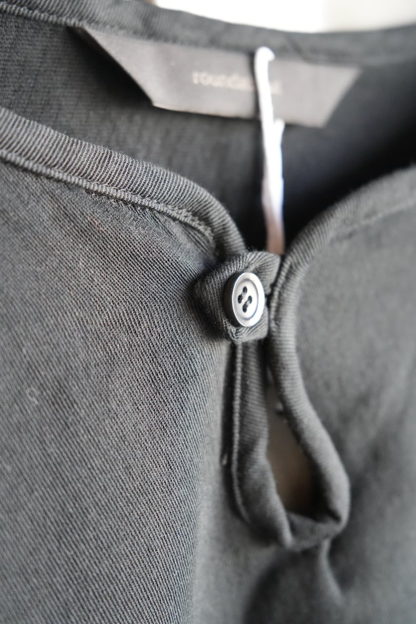 ネックは一つボタンで、シンプルなカットソーにアクセントを。